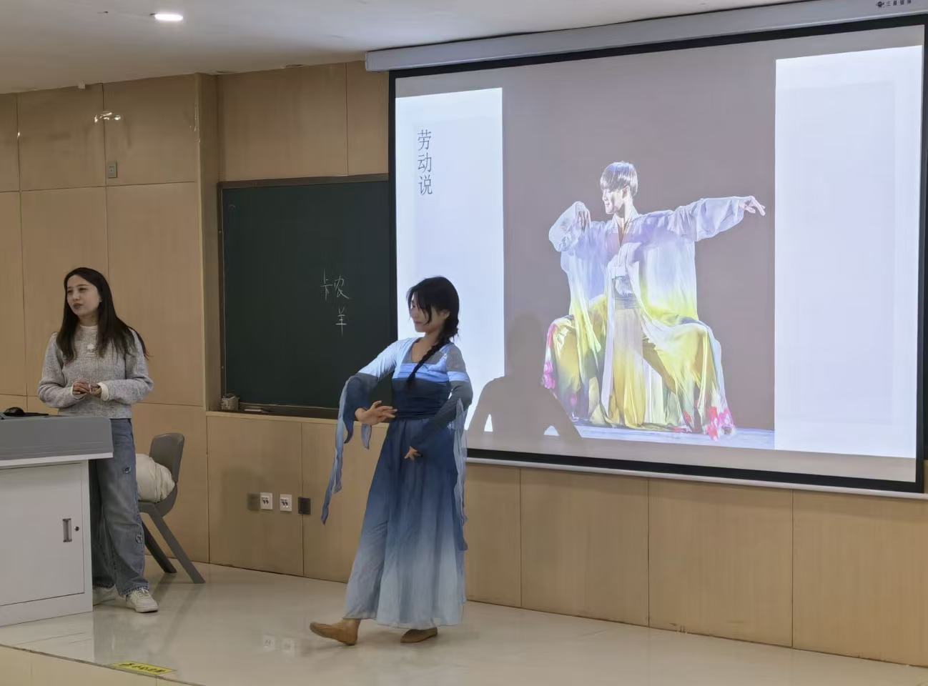 在讲座中,左老师先在“什么是舞蹈”环节从艺术本质定义舞蹈为“以人为载体、以人体动作为核心语言的综合性表演艺术”,结合作品解析其空间性、时间性与动态造型特征,阐释舞蹈通过虚实空间结合传递情感思想的内核;继而讲解“舞蹈从何而来”,梳理模仿说、巫术说、劳动说等六大起源学说,以羌族羊皮鼓舞、英歌舞、汉族秧歌舞等案例具象化解读,最终提出“劳动综合论”,完整呈现舞蹈与人类生产生活的深层联结;