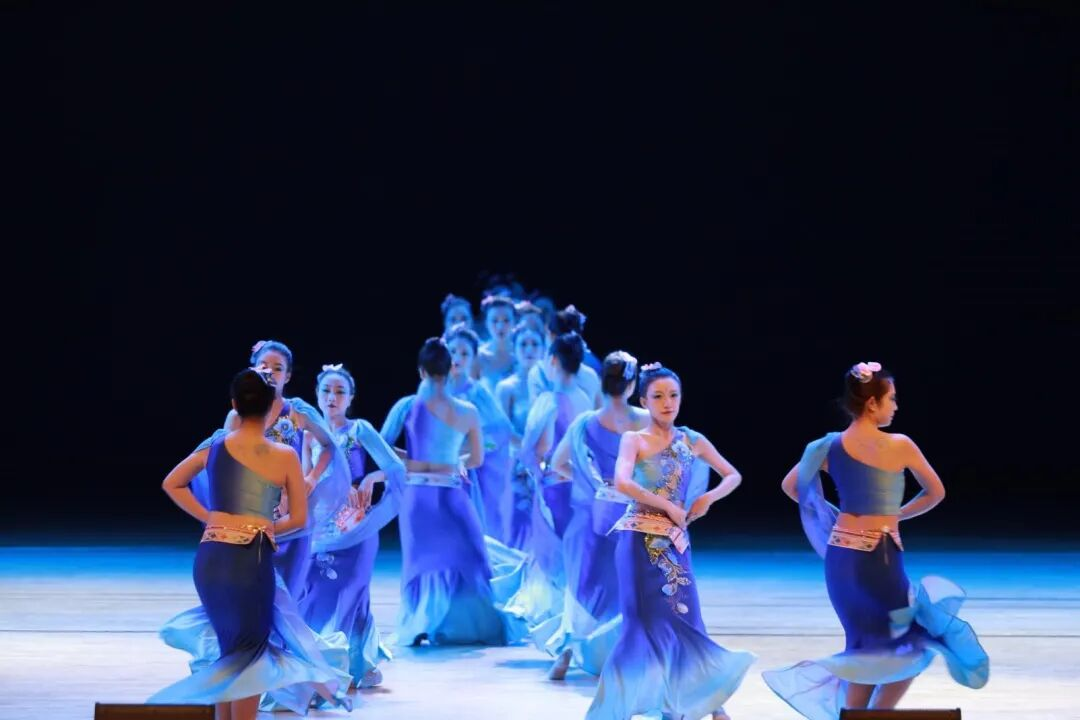 音乐响起,舞台上神秘且温柔的蓝色光束笼罩着婀娜多姿的舞蹈演员们,轻盈的舞步,如同那顺着溪涧流淌的月光,悠然且顺畅,带领我们一步步走进这充满诗意的傣家月下溪涧之境。舞步轻盈,如傣家竹楼边的潺潺溪水,悠然流畅。指尖灵动,如同跳跃在荷叶上的露珠,晶莹娇俏。悠扬的乐曲、跳动的裙摆,她们已经化身为月下溪边的蓝色孔雀!月光洒肩头,静谧而深邃!肩纱上飘动着音符,鱼尾裙摆动着节奏,此时此刻,她们就是雨林深处的仙子。“美”在此时,已经完全具象化了。她的灵动“点水”,光圈氤氲,像是水面涟漪。(点水:傣族舞中轻巧而精致的脚步动作)神态娇俏,一个“林中窥看”的动作,像是在雨林中拨开迷雾,显现出柔美的脸庞。(林中窥看:描绘傣族舞中舞者模仿自然生物时那种好奇而又谨慎的姿态)曲终意深远!悠然灵动的音乐伴随着曼妙的舞姿悄然结束,观众们还沉浸在神秘且美丽的意境中,舞者们在滴滴水声中定格,此刻,时空静止,我们对“美”的感受清晰地停留在这幅诗意画卷中。